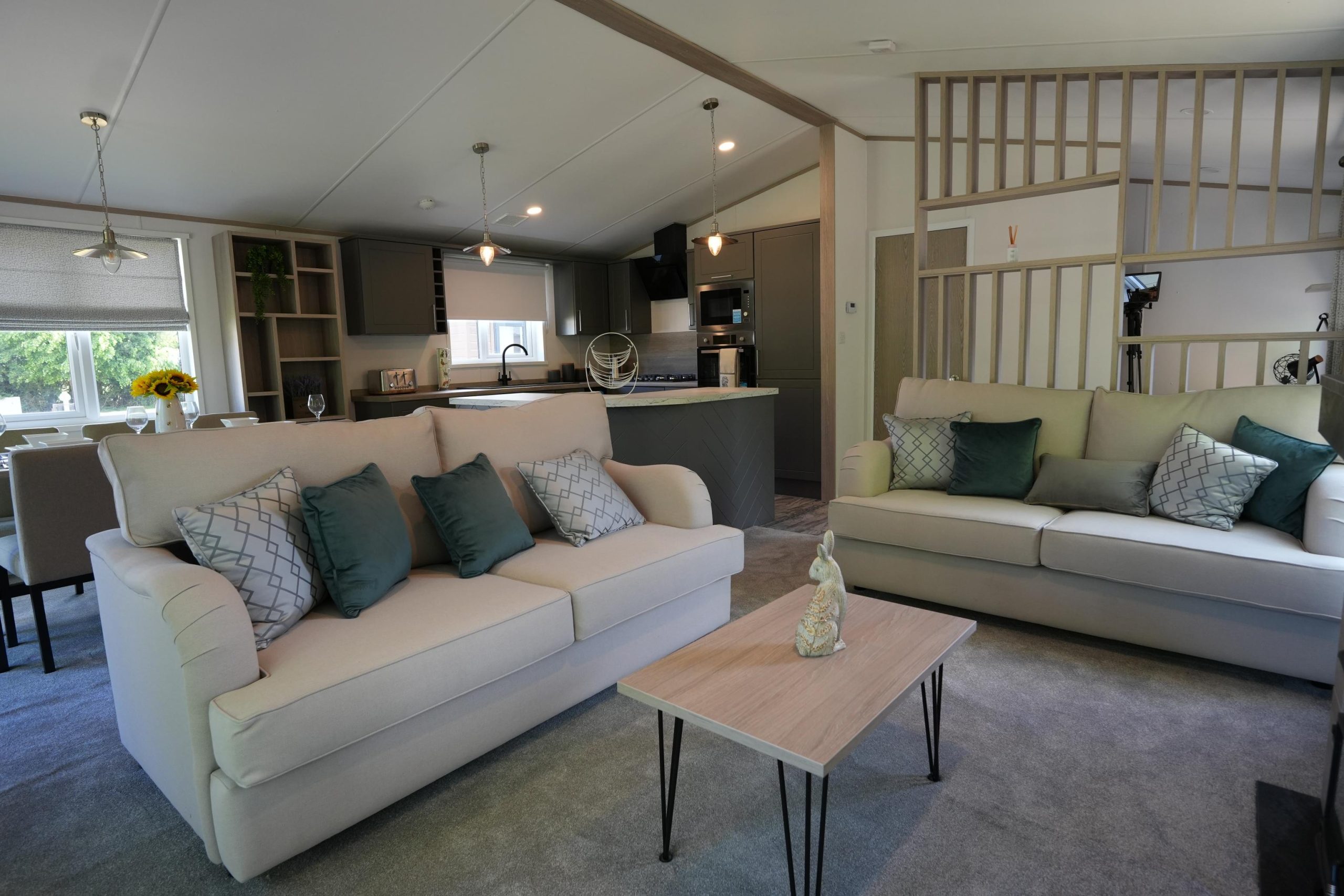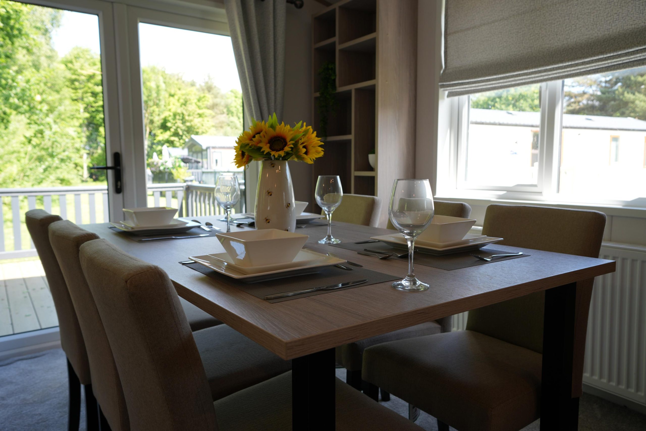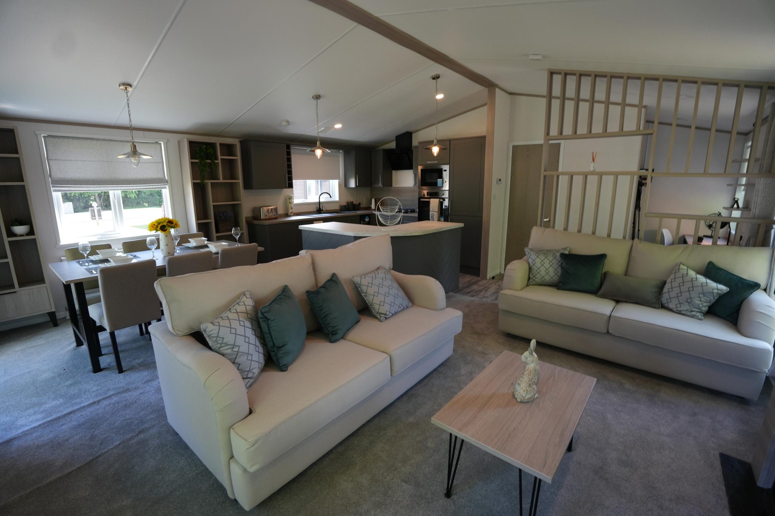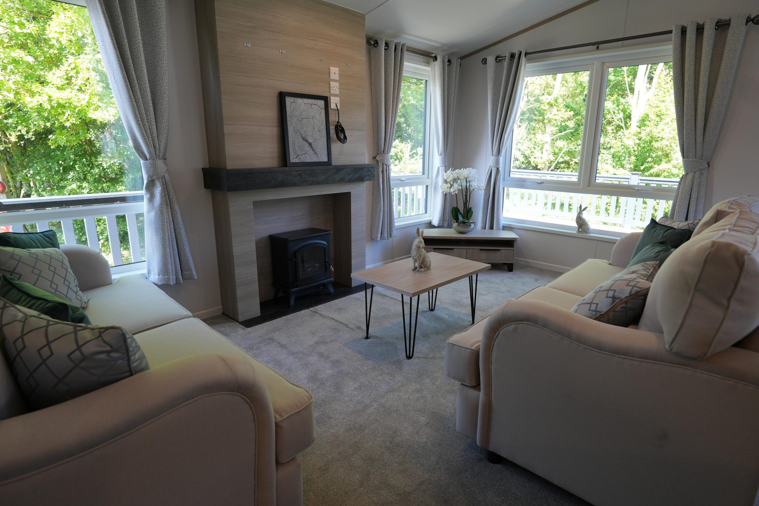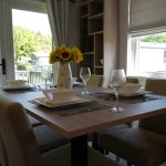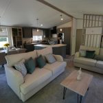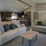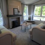 The Lilac Lodge combines comfort and style in its inviting living area, featuring two luxurious 2-seater sofas perfect for relaxation or entertaining. A stove-style electric fire, housed in a full-height wood-effect fire surround, adds warmth and charm. The lounge includes a TV cabinet and contemporary shelf units for ample storage of books, decor, and personal items, maintaining a tidy and stylish ambiance. The dining area showcases a freestanding table and six dining chairs, offering flexibility for family meals, dinner parties, or casual dining, making it an ideal choice for versatile and elegant lodge living.