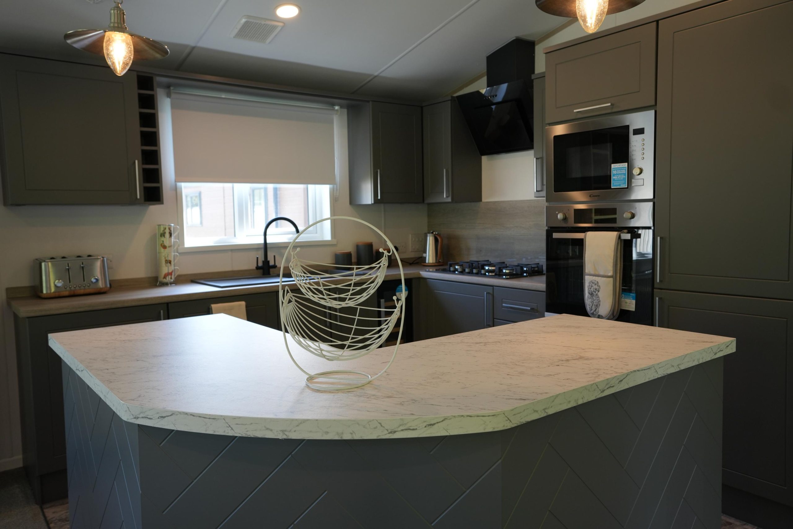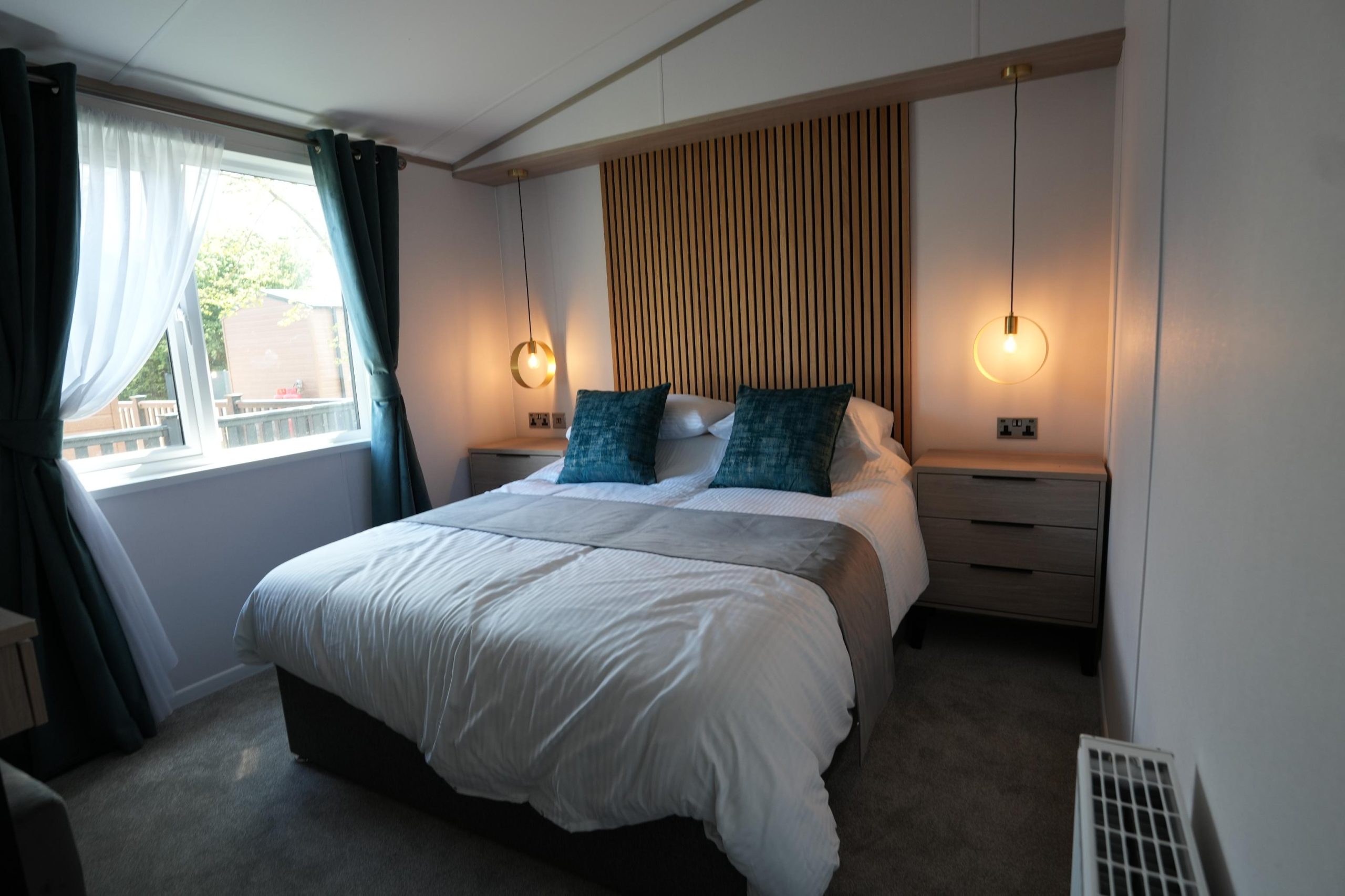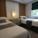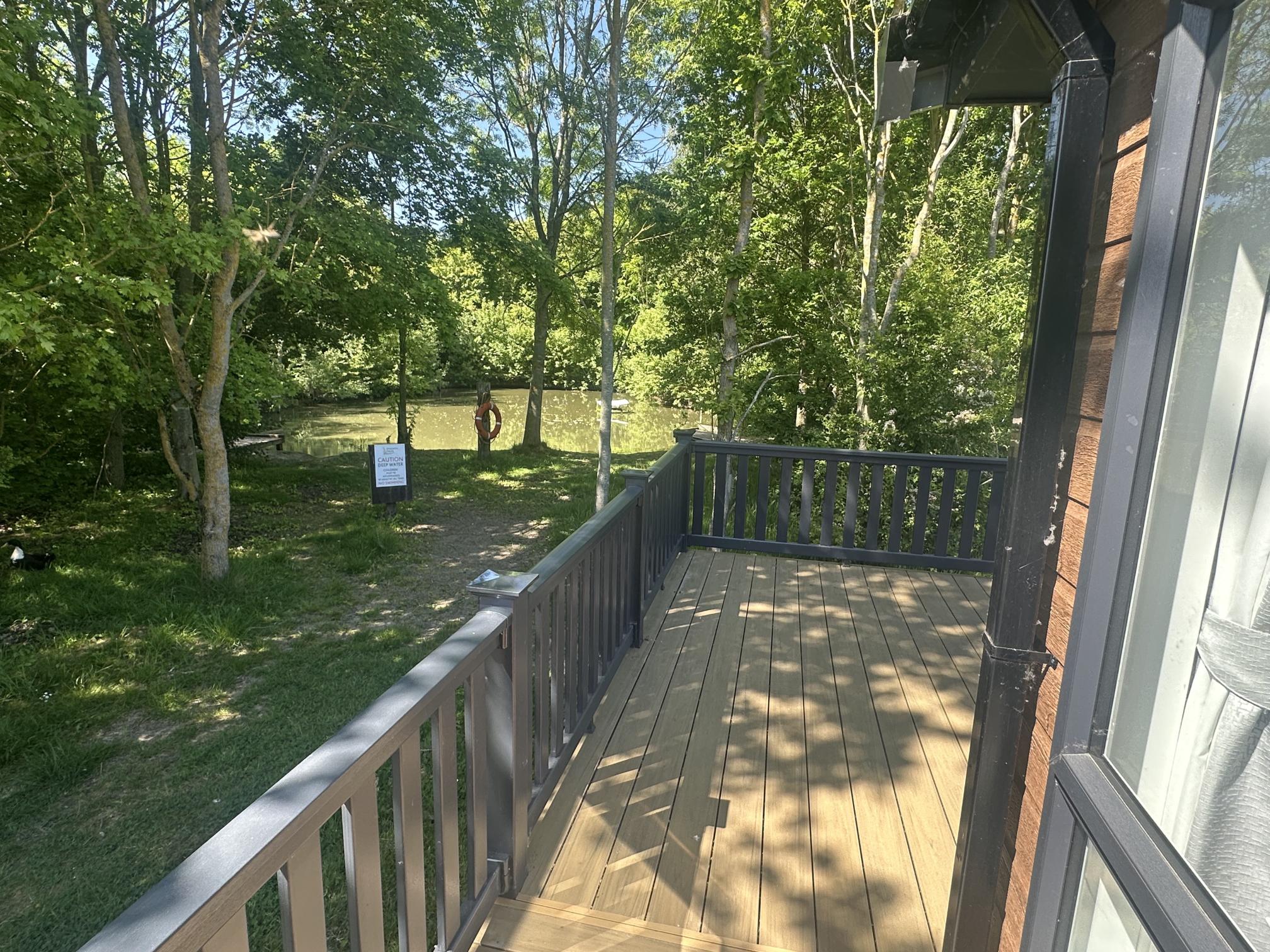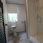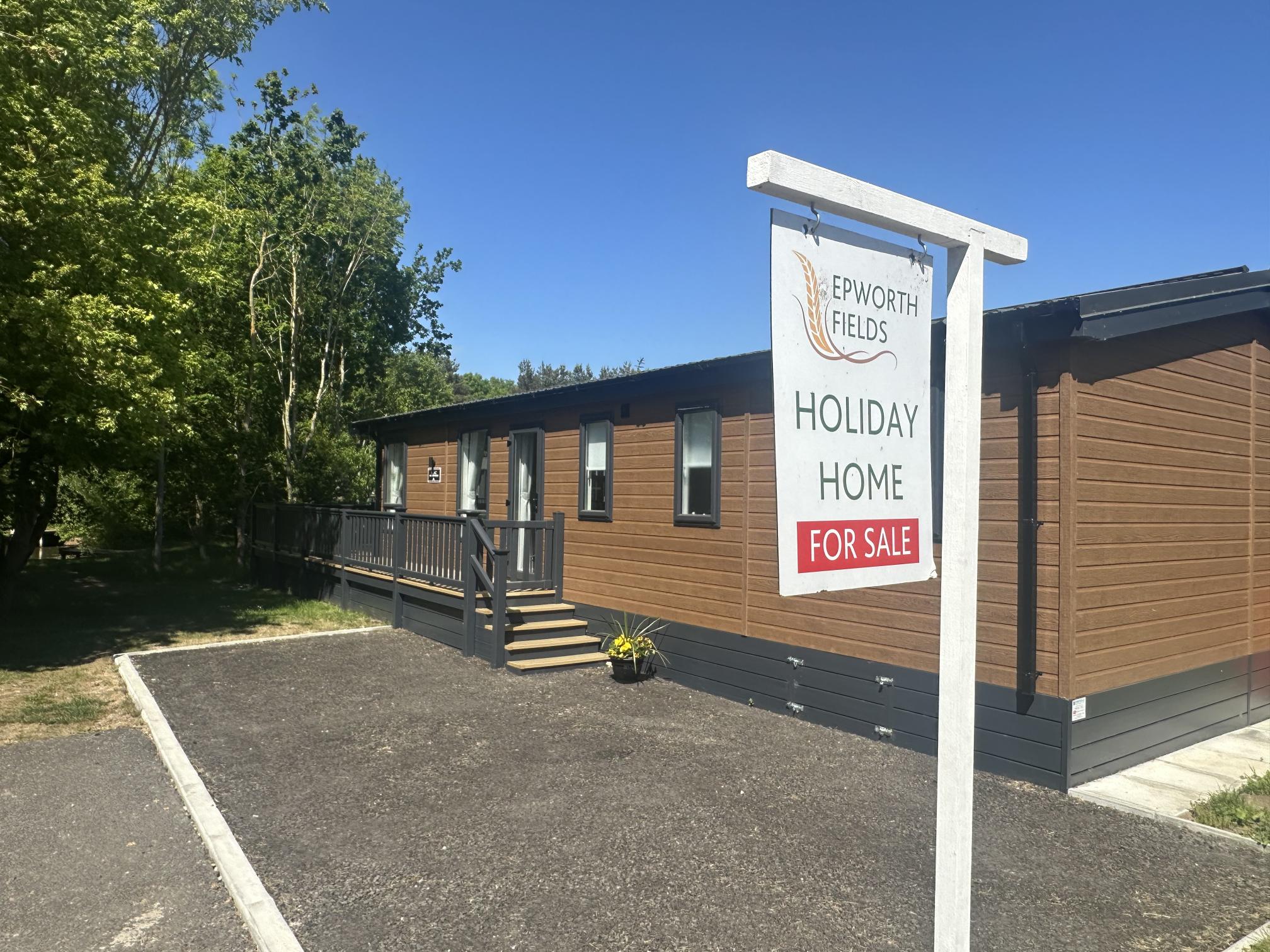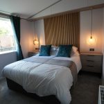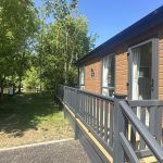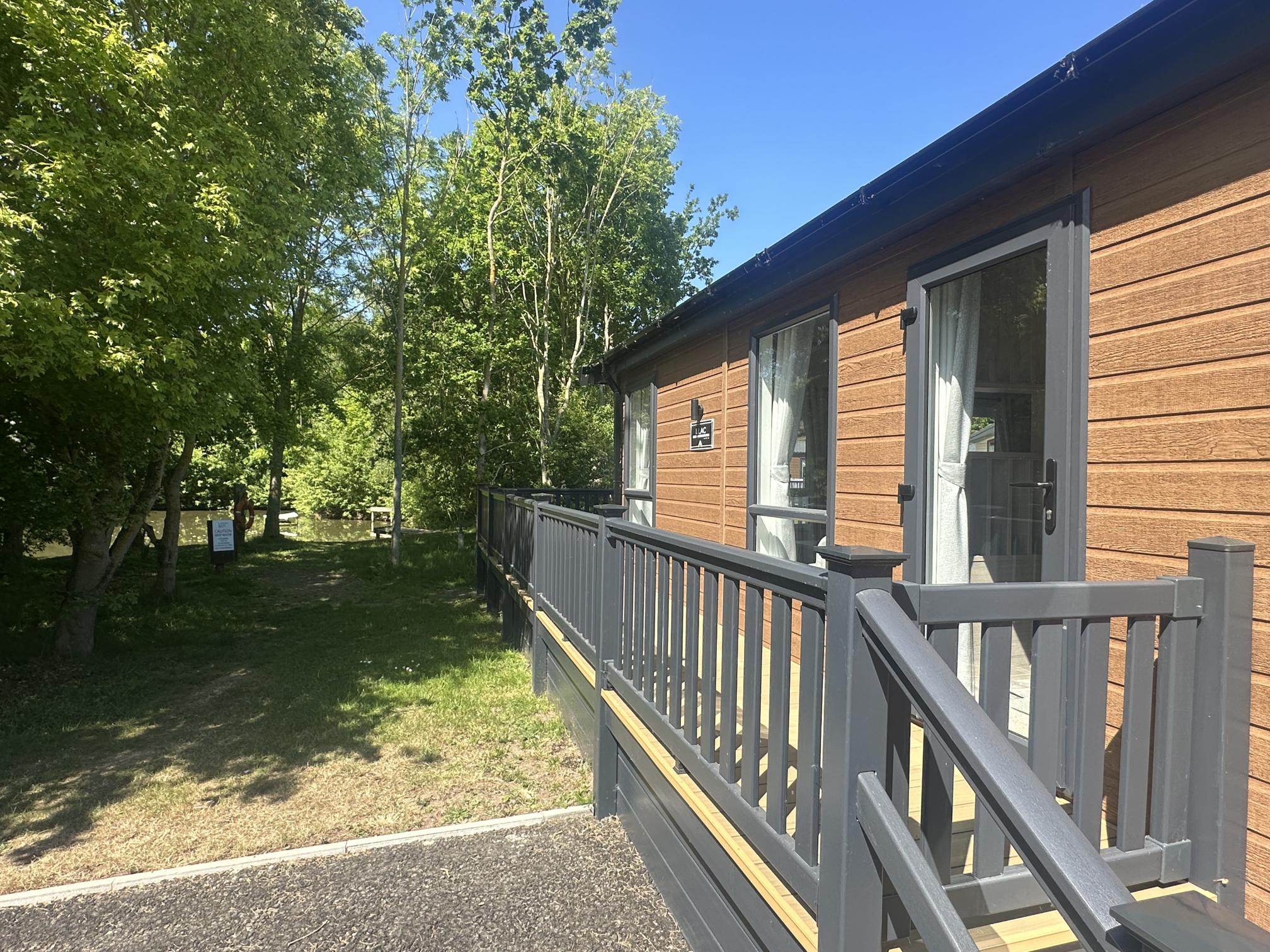 The Lilac Lodge combines comfort and style in its inviting living area, featuring two luxurious 2-seater sofas perfect for relaxation or entertaining. A stove-style electric fire, housed in a full-height wood-effect fire surround, adds warmth and charm. The lounge includes a TV cabinet and contemporary shelf units for ample storage of books, decor, and personal items, maintaining a tidy and stylish ambiance. The dining area showcases a freestanding table and six dining chairs, offering flexibility for family meals, dinner parties, or casual dining, making it an ideal choice for versatile and elegant lodge living.