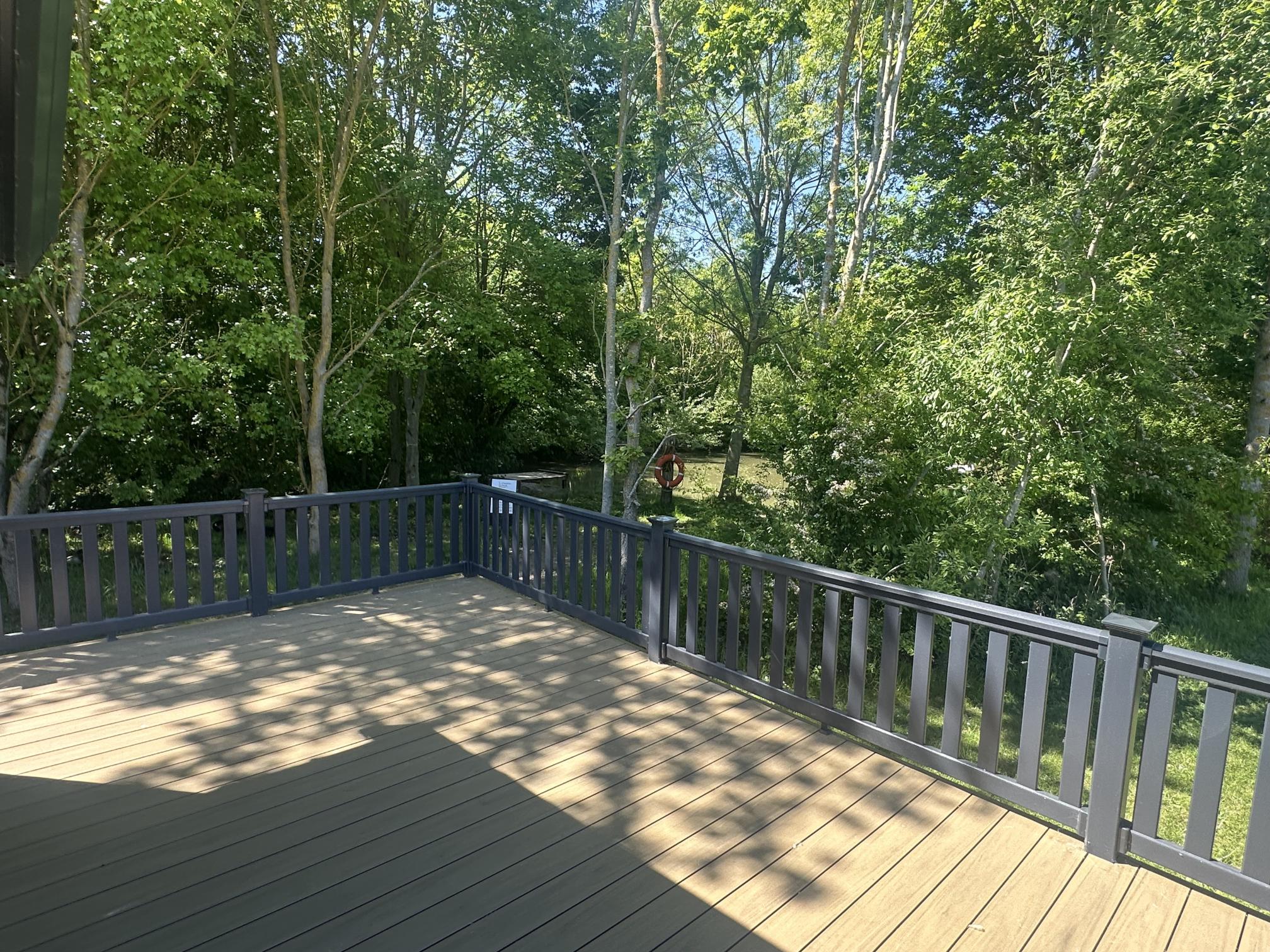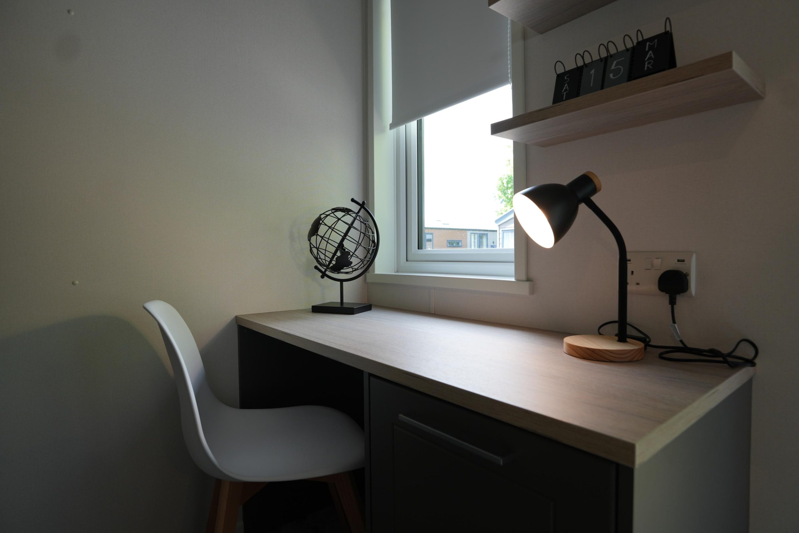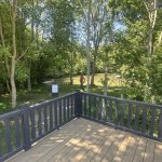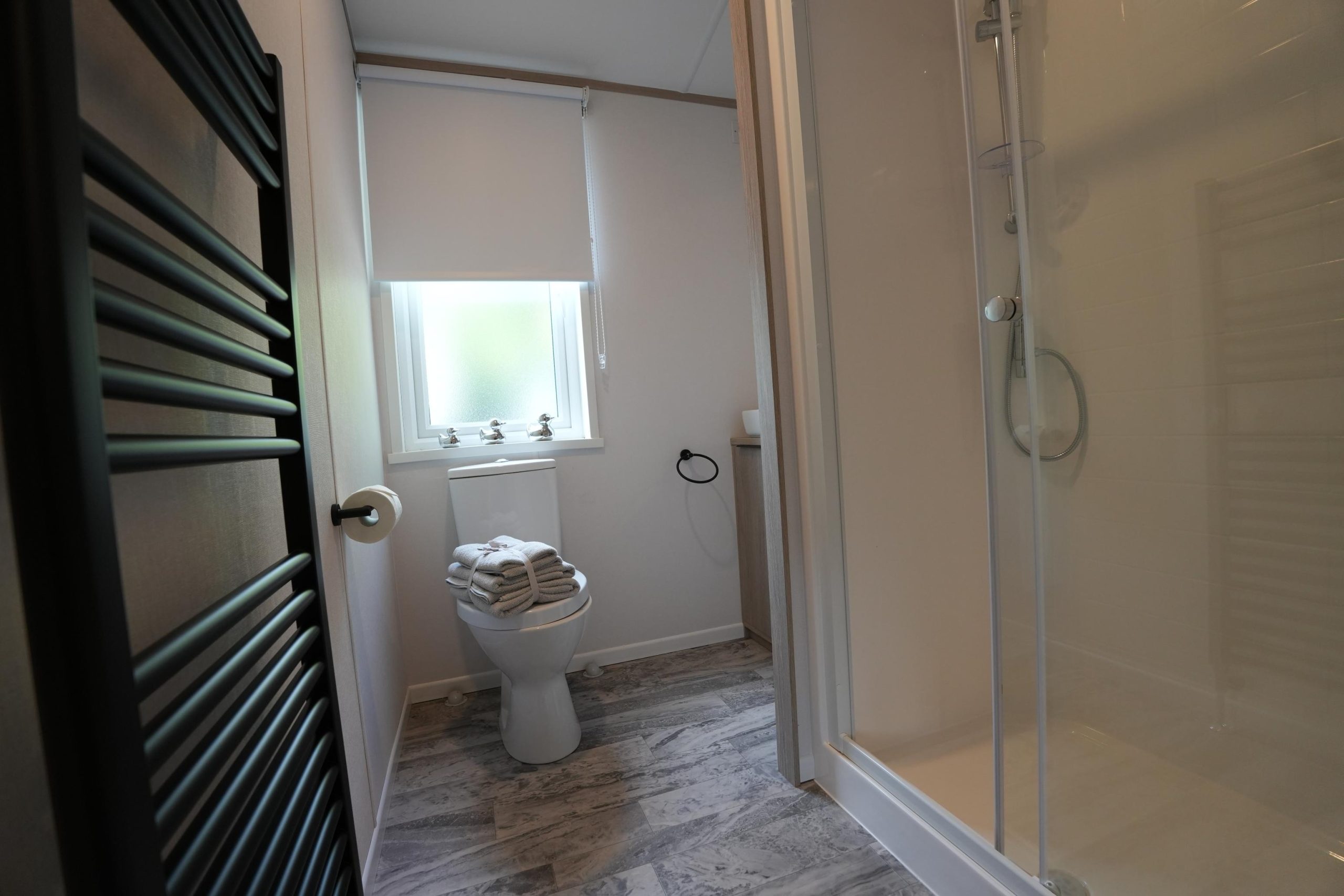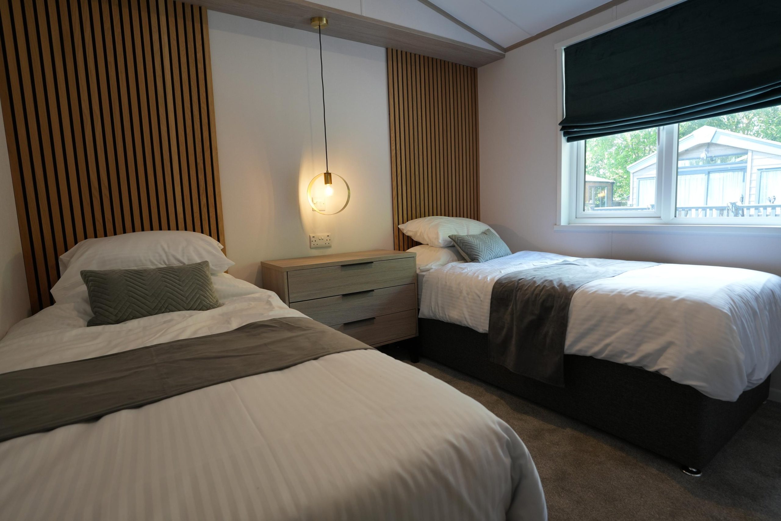 The Lilac Lodge combines comfort and style in its inviting living area, featuring two luxurious 2-seater sofas perfect for relaxation or entertaining. A stove-style electric fire, housed in a full-height wood-effect fire surround, adds warmth and charm. The lounge includes a TV cabinet and contemporary shelf units for ample storage of books, decor, and personal items, maintaining a tidy and stylish ambiance. The dining area showcases a freestanding table and six dining chairs, offering flexibility for family meals, dinner parties, or casual dining, making it an ideal choice for versatile and elegant lodge living.